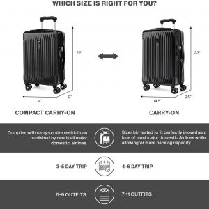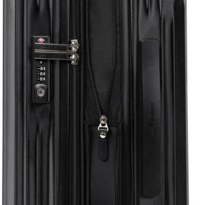 This carry on bag has lightweight, 100% Polycarbonate hard shell that is engineered for impact-absorbing flexibility with a stylish outer finish that helps reduce visible scratches and scuffs. Built-in lock allows TSA authorities to safely unlock and relock the bag for inspection when needed (default code set at 0-0-0)