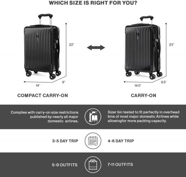 Carry-on luggage is sizer bin tested to fit in the overhead bins of most major domestic airlines while allowing for more packing capacity. 8 Spinner wheels rotate 360°, providing superior maneuverability and a smooth glide in every direction.