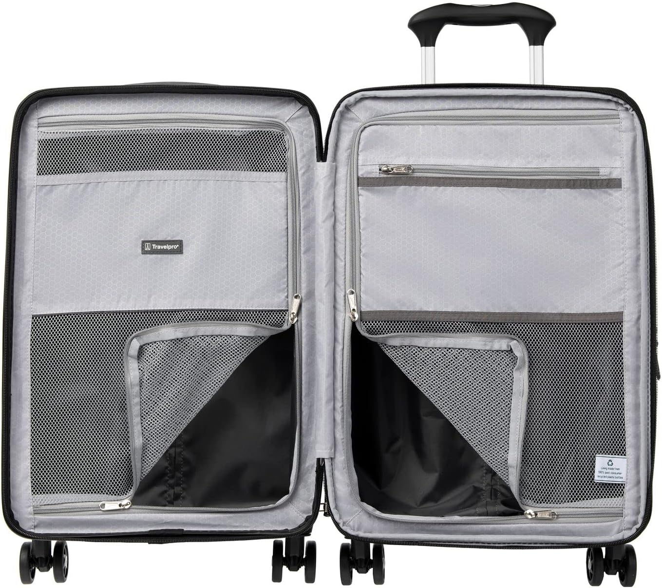 21 inch carry on luggage has interior zippered divider panels and accessory pocket keep contents organized, separated, and secure while the interior lining with H20 guard is made of 100% post-consumer recycled plastic bottles to help reduce environmental waste.