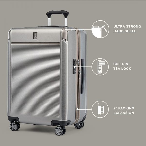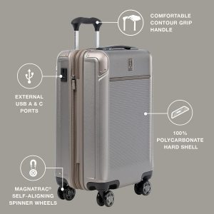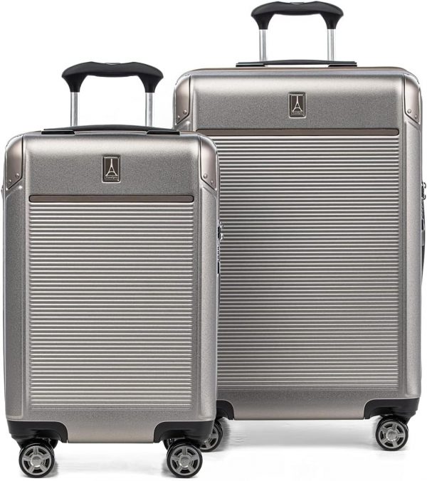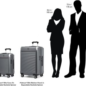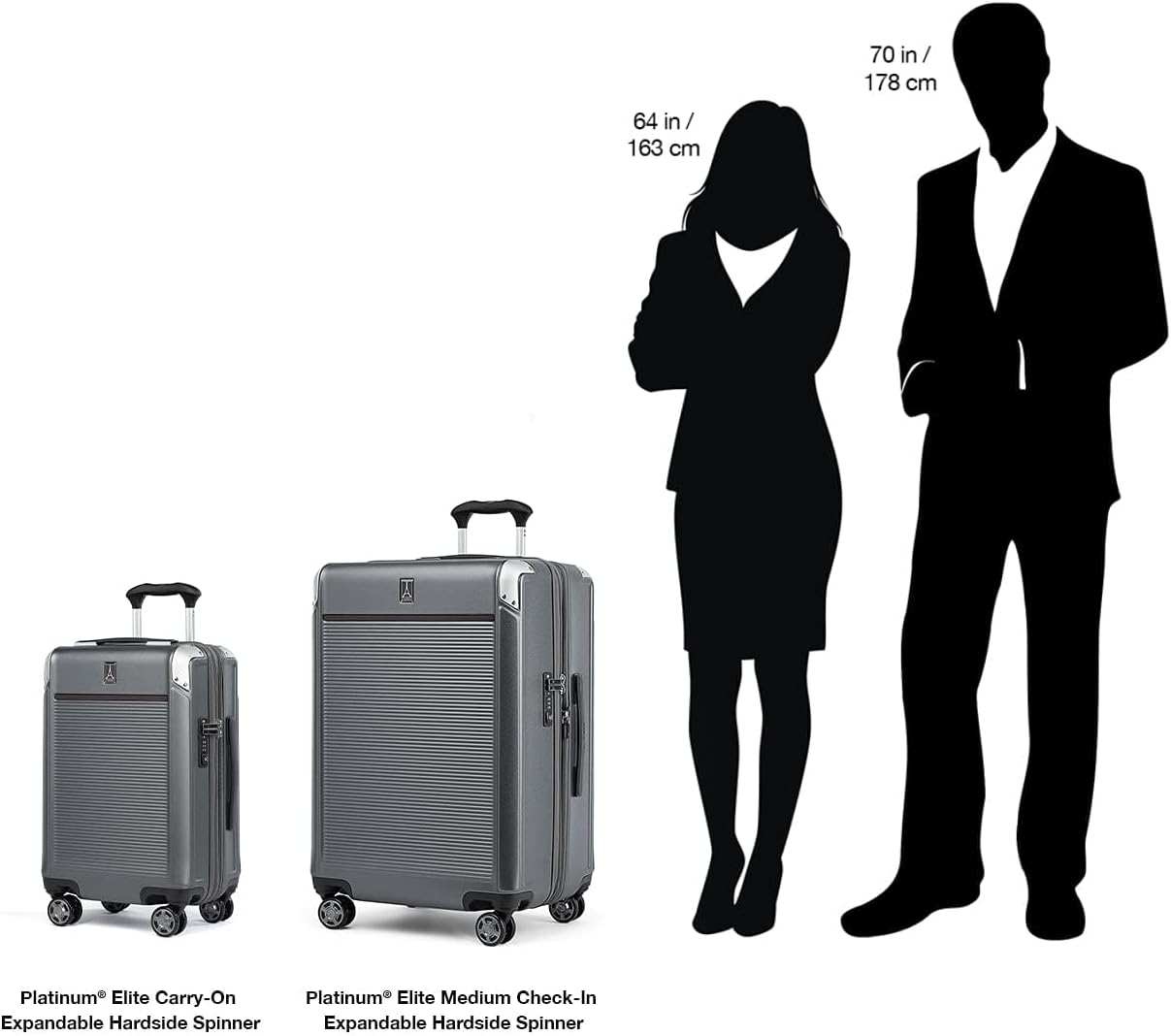 Upgrade your travel experience with the stylish, ultra-durable Platinum® Elite 2 Piece Hardside Luggage Set. This sleek spinner suitcase set with wheels includes a carry on hard shell luggage designed to to fit in the overhead compartment on most U.S. airlines and a checked suitcase ideal for medium and longer trips that complies with published check-in size restrictions for nearly all major domestic airlines. With great looks and ultra-durability with effortless mobility this innovative 2 piece suitcase set is packed with modern conveniences. The carry on suitcase lets you power your electronics on the go using external USB A & C ports with fast-charge capabilities and a dedicated external-access battery pocket (patent pending) that provides FAA-compliant storage for your power bank. Wherever you go, this hard luggage spinner set flies with precise control and effortless roll, thanks to the Travelpro® exclusive PrecisionGlide™ System–eight MagnaTrac® self-aligning spinner wheels led by a sturdy, four-stop adjustable PowerScope Lite handle with comfortable Contour Grip. Designed for great looks and ultimate resilience, this hard suitcase is constructed with an ultra-strong 100% polycarbonate shell that flexes upon impact to prevent cracking and keep contents protected, while its attractive textured finish helps reduce the visibility of scuffs or scratching. 2 piece luggage set has genuine leather trim that adds a sophisticated touch, and distinctive aluminum corner armor protects high-impact areas in style. A built-in lock allows TSA authorities to unlock and lock safely and securely when needed. Both the carry on bag and checked bag have the zippered 2″ expansion option that gives you increased packing capacity when needed. Interior zippered divider panels and adjustable hold-down straps keep contents organized, separated and secured. Hard shell luggage set has multiple accessory pockets that provide built-in organization, and a water-resistant pocket provides a convenient place to stow away damp items or toiletries. Hard sided luggage with spinner wheels is backed by our Built For a Lifetime Limited Warranty with the Trusted Companion Promise that even covers damage caused by airlines or other common carriers for the first five years of the lifetime warranty.
