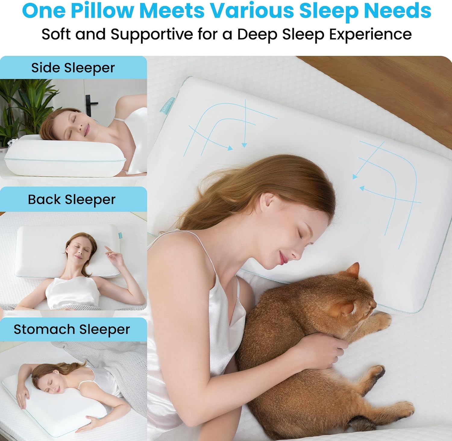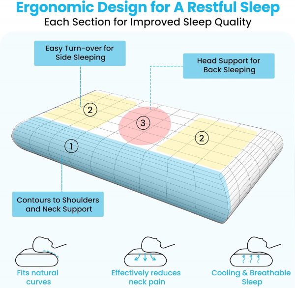 【Ergonomic Design for All Sleepers】- The cervical neck pillow’s precise design, shaped through multiple trials, perfectly suits various sleeping positions—side, back, and stomach. Its ergonomic three-zone design, allows the pillow to conform to shoulder and neck curves, offering ample head support and effectively reducing neck pain and pressure.
