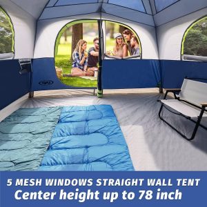 ✅【5 Breathable Mesh Windows 】The camping tent has 1 large mesh door, 5 mesh windows & mesh tent top,which allows the breeze to come in, zippered access allows campers to adjust the vents from inside the tent mesh paneling and doors offer great views and ventilation.