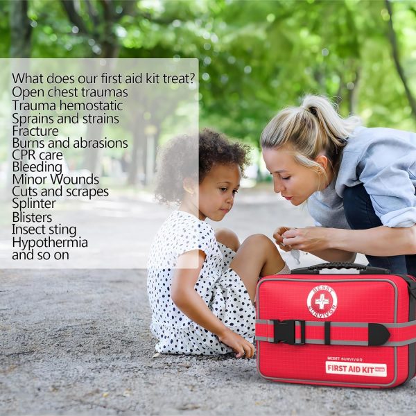 ✅【Upgraded Comprehensive First Aid Kit】This is a premium first aid kit contains 265 Pieces first aid supplies -2x Chest Seals, Israeli Bandages, Splint, flashlights, glow stick, CPR Kit,Pill box etc. This deluxe first aid kit contains enough supplies to treat a family or a group of friends at camping, hiking, or during hurricanes, earthquakes and tornados.