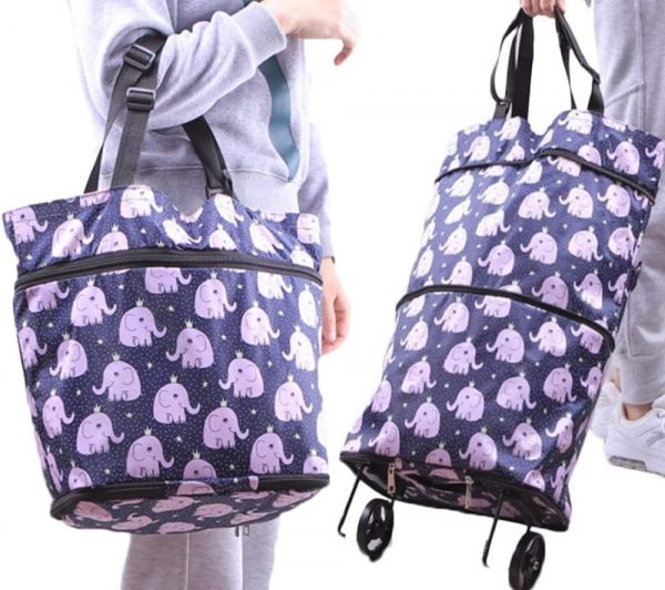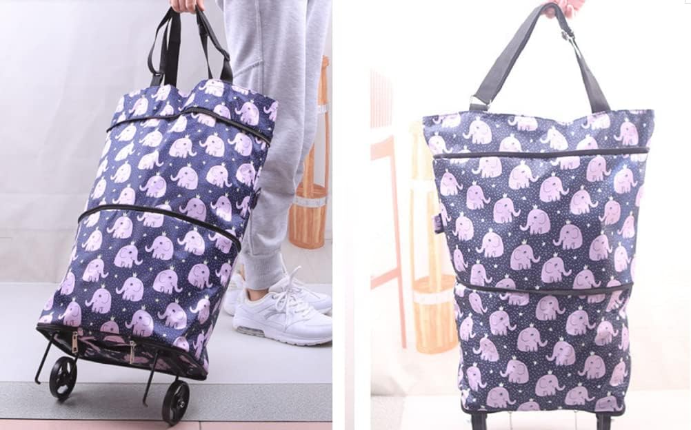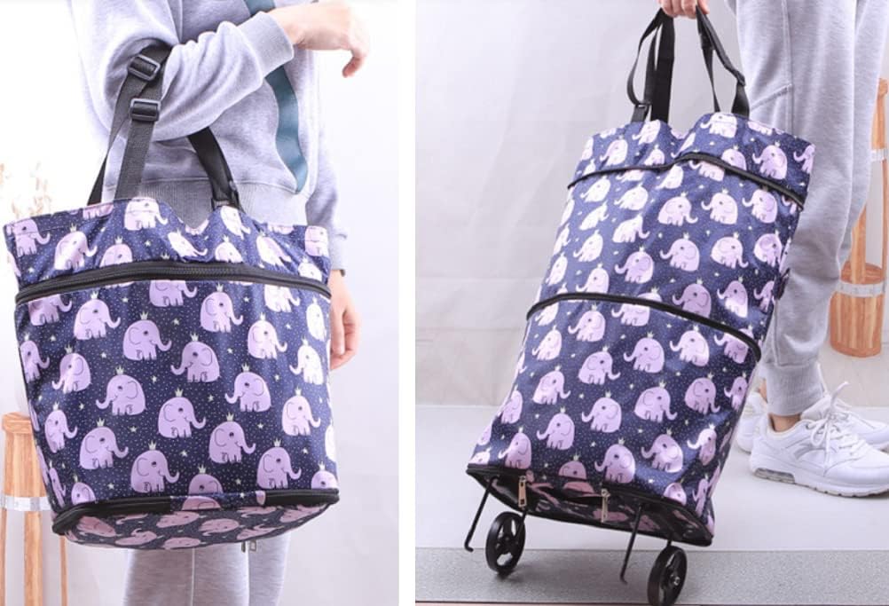 【Design】Foldable wheels for you to switch between shoulder bag or expand to full size as a shopping cart. It will stand up its own when fully extended. The bottom is high-quality board with foldable wheels and button closed, and it is enough firm and solid. Whenever you need, just open the zipper and the shopping bag is stretching.The trolley bag handle is anti-slip and convenient for you to hold.