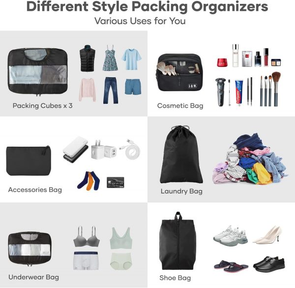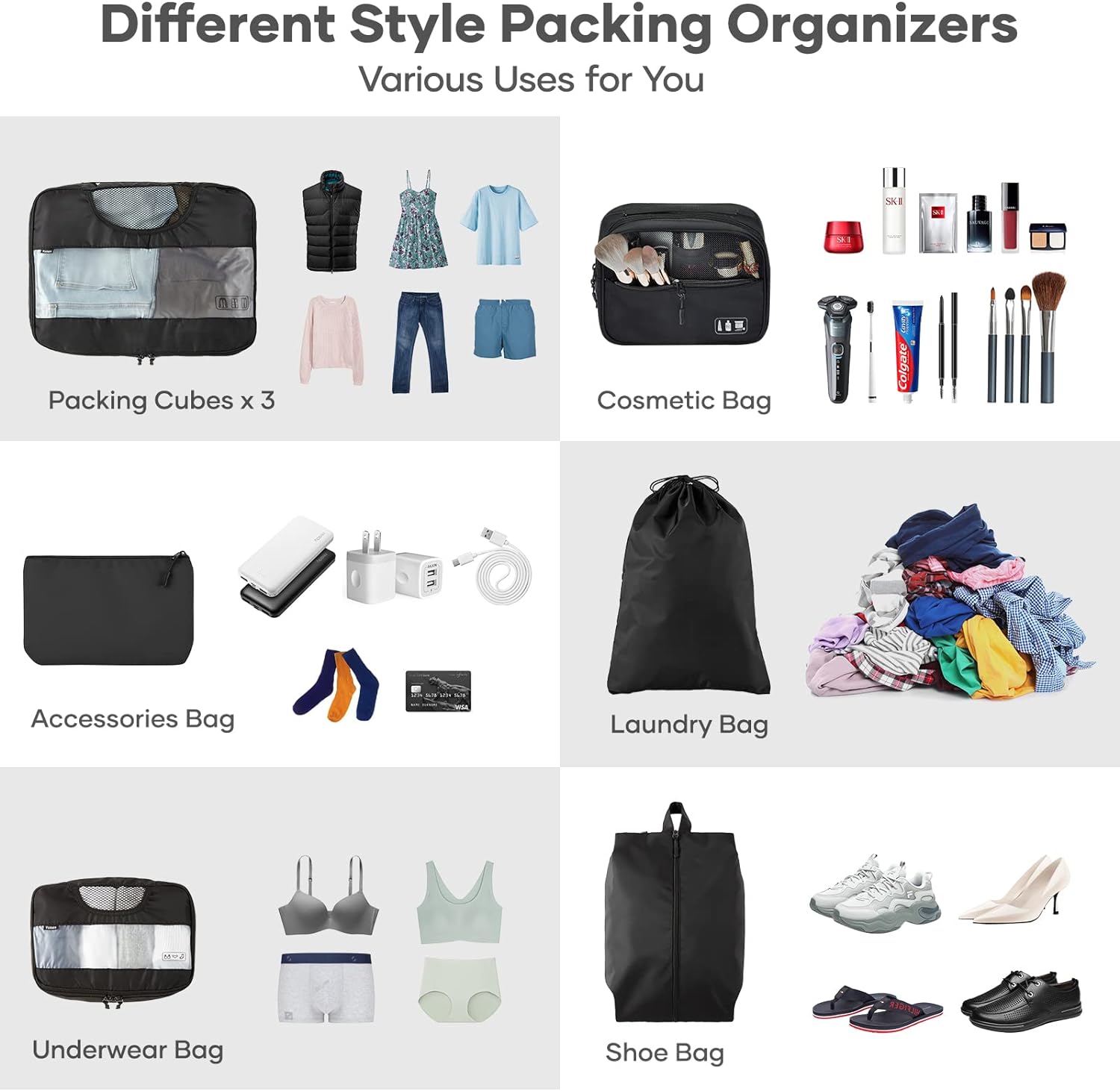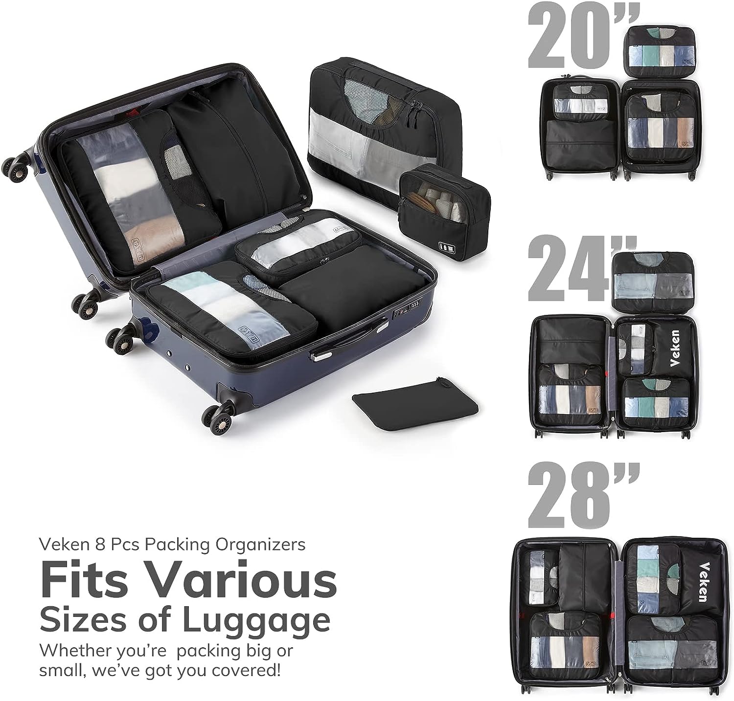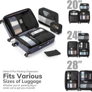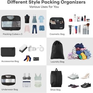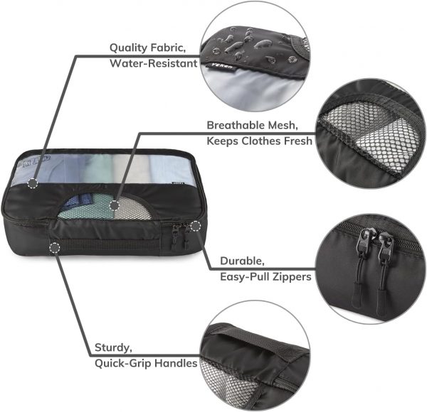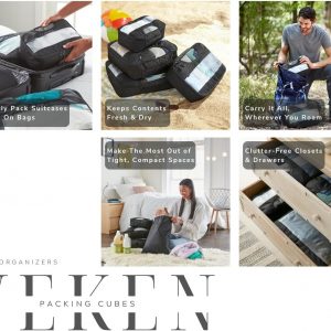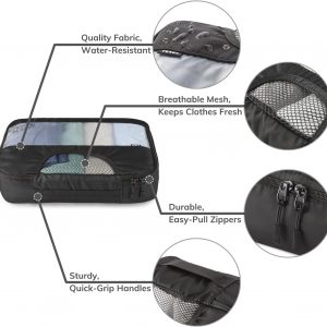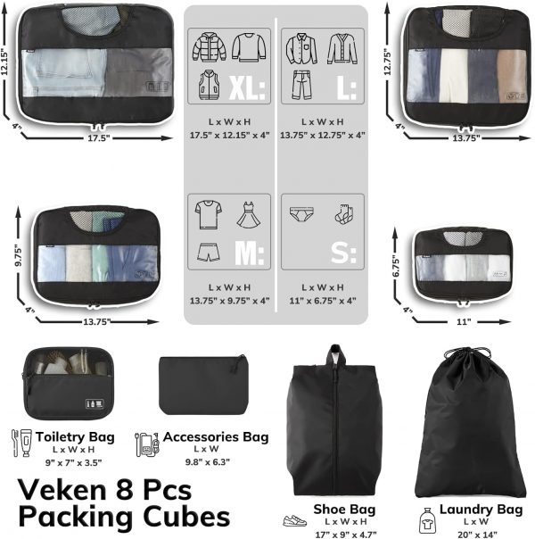 Product Includes: Extra Large Cube ( 17.5″ x 12.15″ x 4″) Large Cube (13.75″ x 12.75″ x 4″) Medium Cube (13.75″ x 9.75″ x 4″) Small Cube (11″ x 6.75″ x 4″) Shoe Bag (16.96″ x 9.06″ x 4.72″) Laundry Bag (20″ x 14″) Toiletry Bag (9” x 7” x 3.5”) Accessories Bag (9.8” x 6.3”)