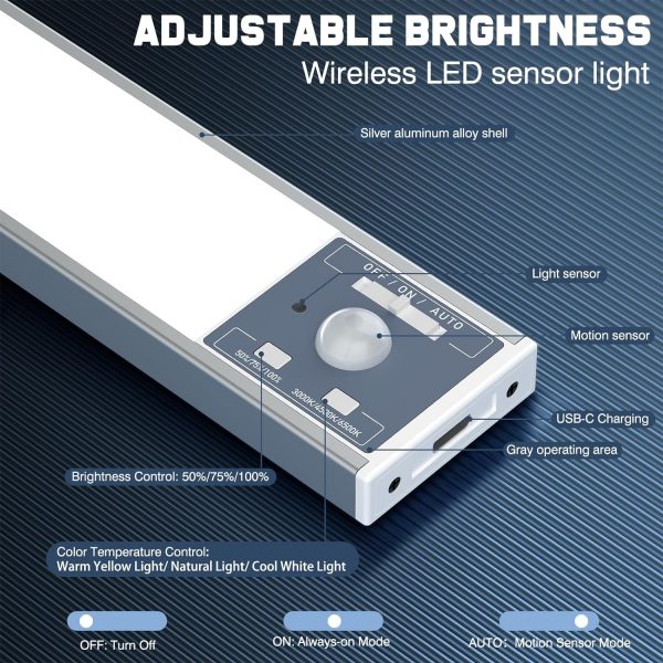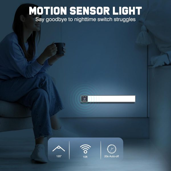 💡[3 Working Modes] The under cabinet lighting has 3 working modes, Always On, Turn Off and Auto Mode (Motion Sensor Mode). In Auto Mode, in dark or low light environment, when motion is detected within 120° and 10 feet, the closet light motion sensored will turn on automatically until it turns off automatically after 20 seconds when no motion is detected. In Always On Mode it will stay on all the time and can be used as a night light.