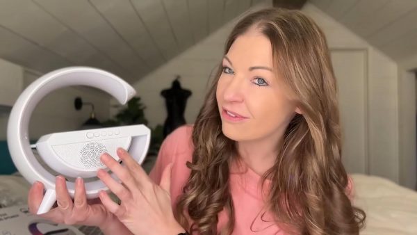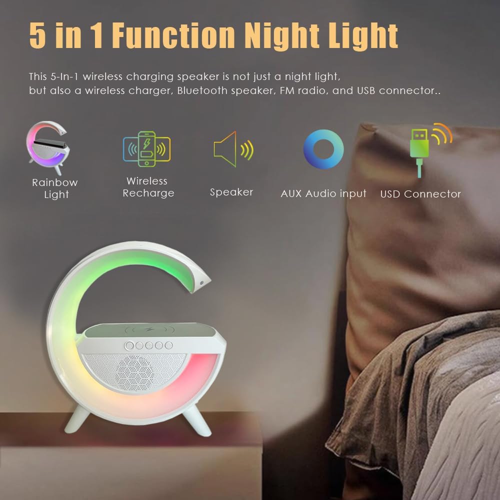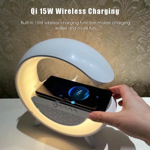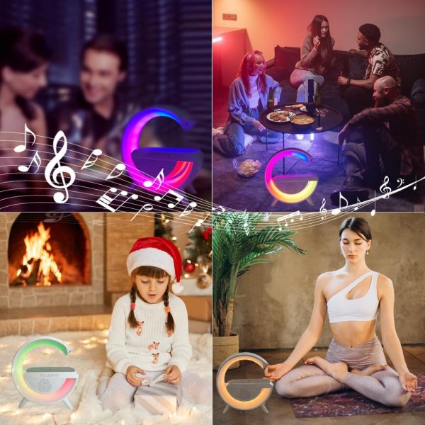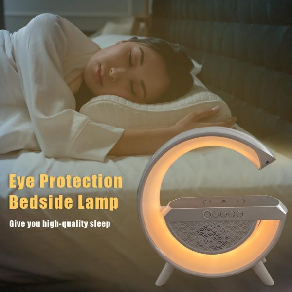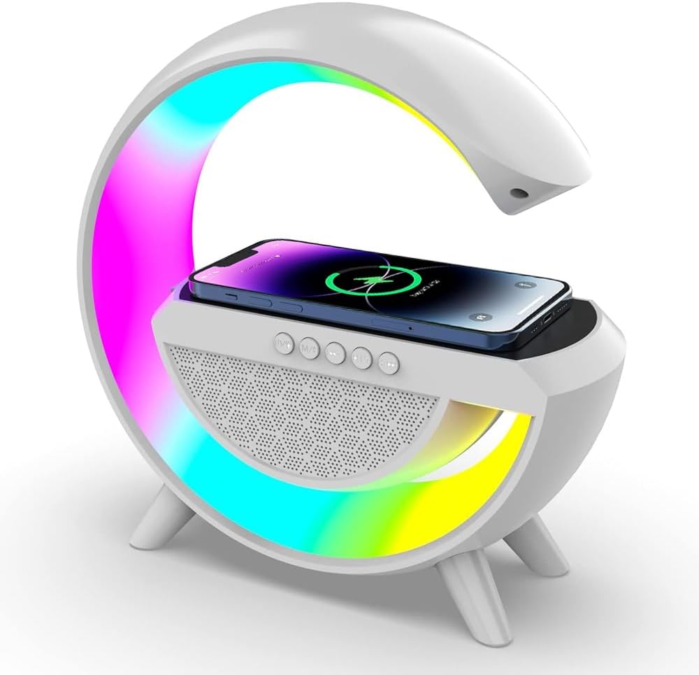 WENSUNNIE Desk Versatile Lit Lamp with Wireless Charger, Mood Lighting with Bluetooth Speaker, 15W Qi Wireless Phone Charger, LED Bluetooth Night Light Table Lamp (G-Shaped White)