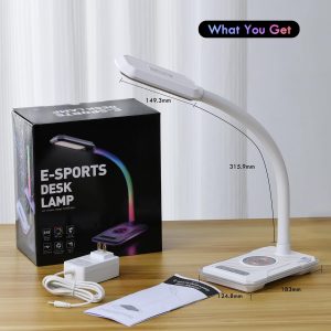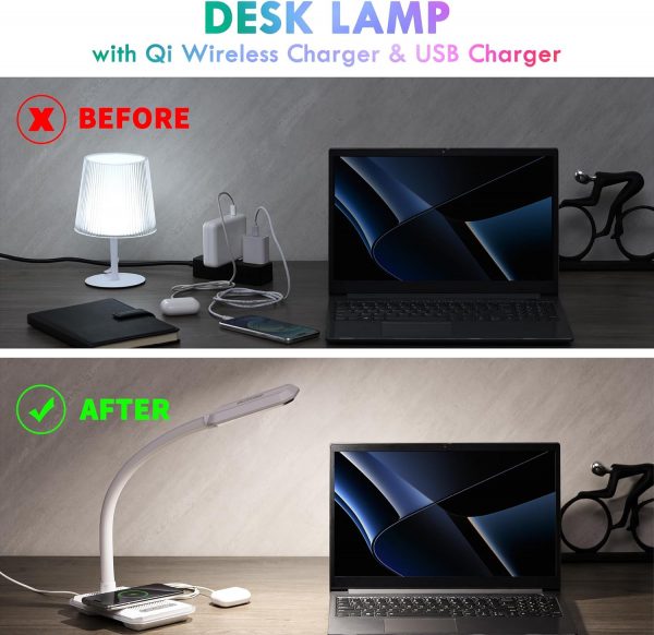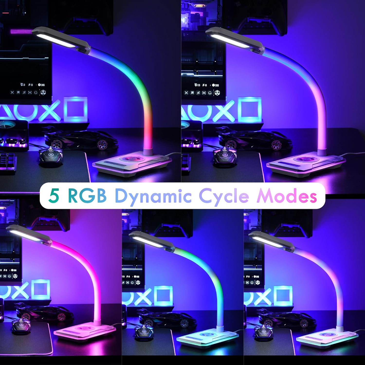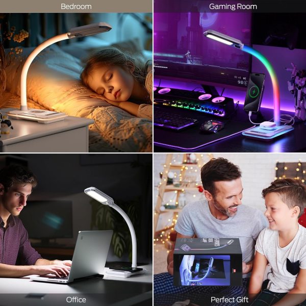 【Lamp with Charging Station】Equipped with a USB charging port and a 10W wireless charger, the desk lamp allows simultaneous charging for two devices. The wireless charging function is compatible with devices certified by Qi. The USB charging function supports 5V/2.1A power devices, making it perfect for charging multiple devices while gaming, working, studying, or relaxing.