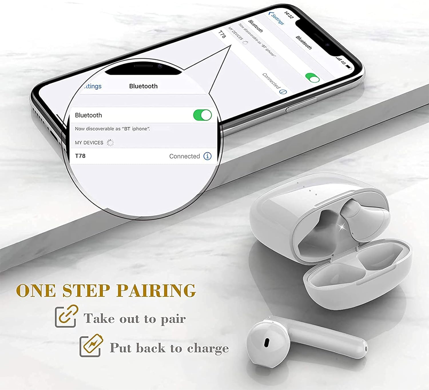 Step 1: Open the charging case cover.Step 2: Turn on the Bluetooth of your phone and choose T78. (After the first pairing, you just need to turn on the Bluetooth on your phone without choosing T78 to set up connection)