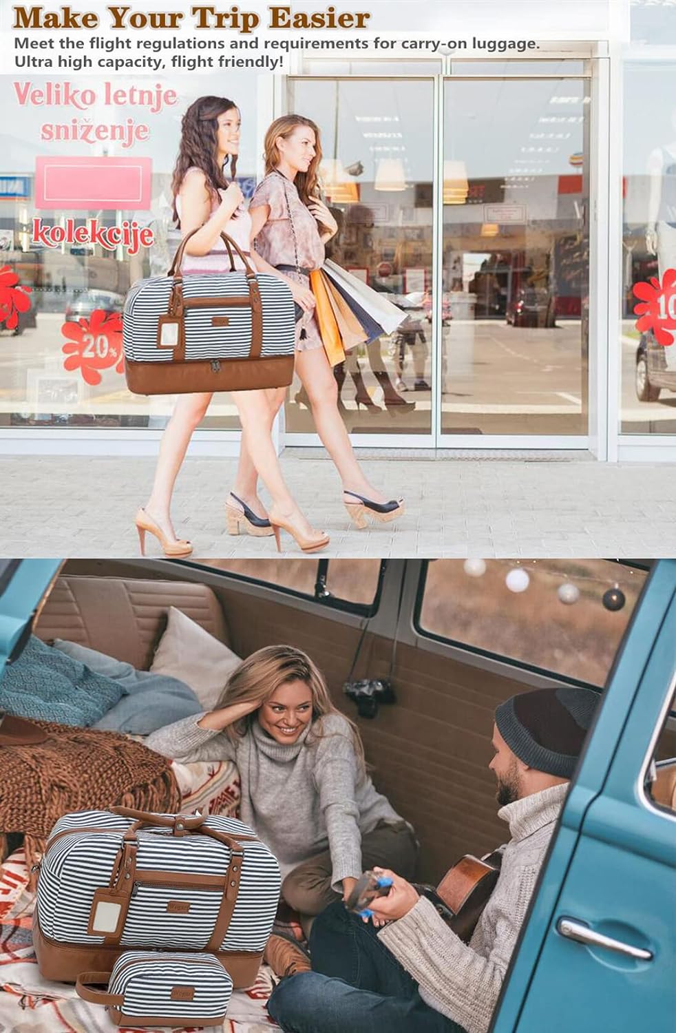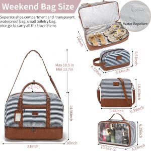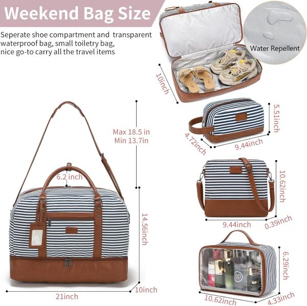 【Perfect 4PCS Weekender Bag】The travel weekender bag comes with $18 toiletry bag, 2 adjustable & detachable shoulder straps,card pocket and shoe compartment. This weekend bag is crafted with waterproof premium soft canvas and PU leather material, Durable and not easy to wear. Perfect for men and women to use in daily travel or business trip,meet the flight regulations and requirements for carry on luggage.