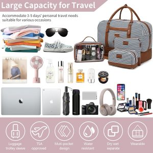 【Large Capacity & Comfortable Shoulder Strap】The weekender bag featuring multiple pockets and compartments for stuff organization, roomy space can fit in 3-5 days of travel essentials, easily fit into your clothes, toiletries, shoes, laptop(can hold up to 21″ laptop)ipad and other items.And also equipped with a removable and adjustable shoulder strap,can make as a cross-body bag,shoulder bag, handbag. The strap is soft and heavy duty, which could let your hands free.