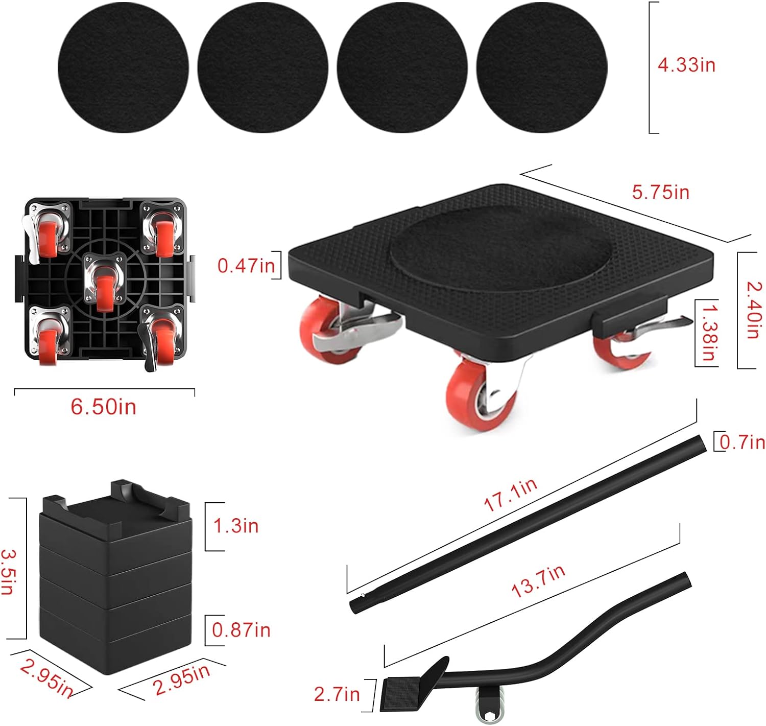 【Upgraded Furniture Dolly Movers】:The furniture dolly set has been upgraded with 4 oversized carbon steel panel trolleys,thickened and widened rubber wheels that can be rotated 360° flexibly,1 extended furniture lifting tool made of carbon steel,equipped with 4 heightening spacers,4 Flannel non-slip mat is superior to other products to the greatest extent,and you will get the best moving artifact.