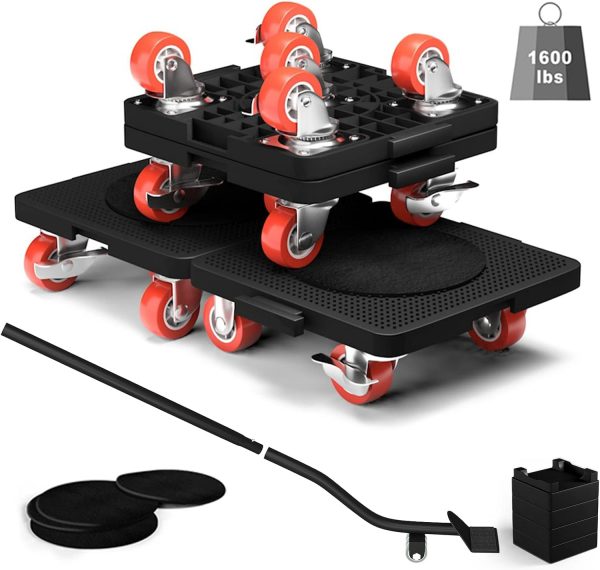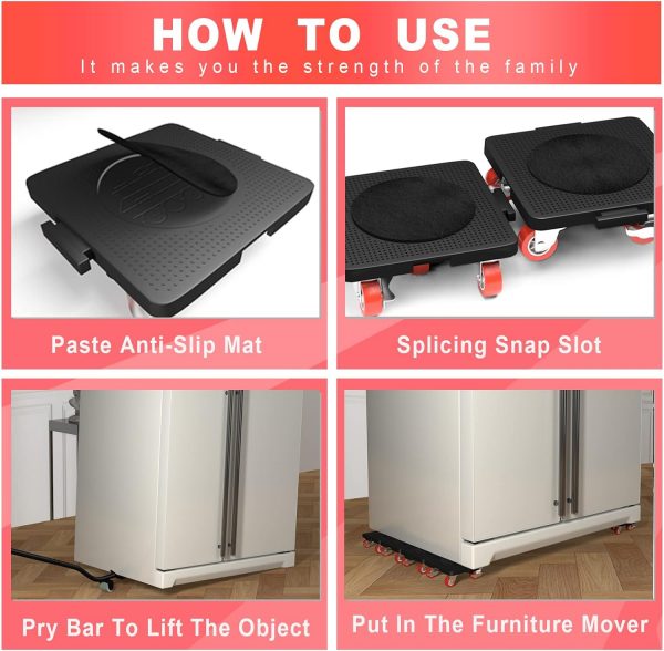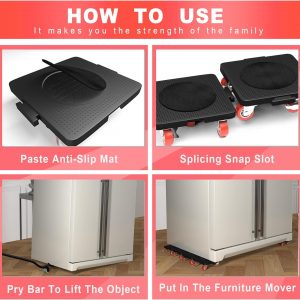 【Easy to use】:Lift the feet of the furniture with a pry bar, if you need to raise the height can be put to raise the cushion,then put in the moving dolly on the bottom of the furniture,and lock the universal wheel,repeat the above operation,the four furniture moving wheels into the bottom of the furniture,and then open the universal wheel brake,without the help of others,you can easily move furniture and other heavy objects.