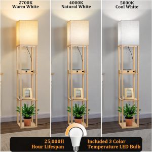 【Upgraded】Floor Lamp with Shelves, LED Shelf Floor Lamps with Wireless Charger & USB+Type-C Charging Ports & 2 AC Outlets, 3 Color Temperature Wood Tall Standing Lamp for Living Room, Bedroom, Office