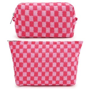 2 Pieces Makeup Bag Large Checkered Cosmetic Bag Pink Capacity Canvas Travel Toiletry Bag Organizer Cute Makeup Brushes Aesthetic Accessories Storage Bag for Women