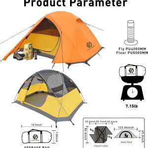 2 Person Camping Tent with 3 Aluminum Alloy Poles, 4 or 3 Season Waterproof Tent, Double Layer,Easy Setup, 2 Doors for Outdoor Hiking,Mountaineering,Survival,Travel